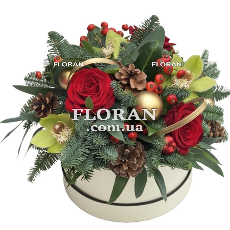 Box with a composition for Christmas - product code FL-2171 - is an amazing gift that brings joy and festive mood. In this composition you will find: 3 orchids that symbolize beauty and sophistication. They give the composition a refined look and delicate aroma. 4 red roses symbolizing love and passion. They give the composition a bright and emotional accent. 4 Christmas balls that remind you of the festive atmosphere of Christmas and New Year. 5 cones that add natural texture and authenticity to the composition. Spruce or pine branches that create a forest atmosphere and are reminiscent of a traditional Christmas tree. This composition will be a great decoration for your home or office in the run-up to Christmas. It can also serve as a wonderful gift for your loved ones or colleagues. All the elements of this composition fit perfectly together, creating an atmosphere of warmth and comfort during this special festive period.