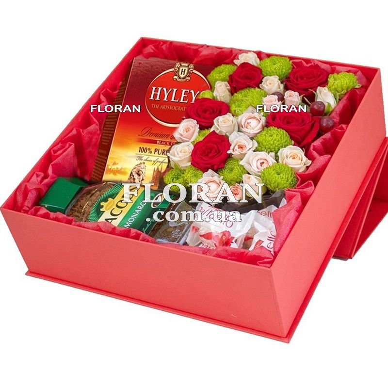 Box with flowers and tea - product code FL-2033. This amazing flower and tea box is a wonderful gift that is suitable for both men and women. Sometimes there are situations when you need to congratulate a loved one, but you are far away. Our delivery service is ready to take care that your gift really reaches the addressee. We will do our best to make this moment special and unforgettable. Also, if you need, we can deliver the box anonymously to create mystery and surprise for the recipient. This gift is a real find for those who appreciate the beauty of flowers and cozy tea parties. Inside the box you will find fragrant Jacobs coffee and leaf tea that will warm you up on a chilly evening. Raffaello sweets will add a touch of sweetness to this treat. And, of course, we must not forget about the beauty of flowers. Five red roses and four creamy spray roses, as well as a chrysanthemum, will decorate the space and give bright colors to the holiday. Let your gift become a symbol of your care and attention, and give joy and smiles to your loved one, even if you are far from each other.