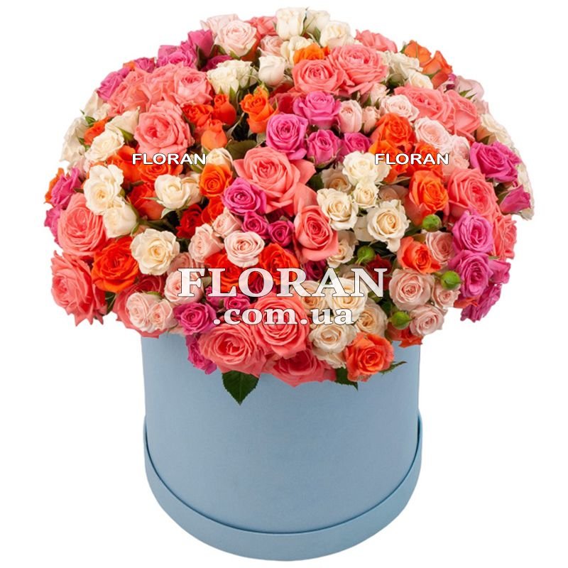 Box with spray roses - product code FL-1773 - is an elegant and impressive gift that will bring beauty and joy to the recipient's life. The combination of multi-colored spray roses creates a bright and attractive image, filling the space with fragrance and colors. Shrub roses are distinguished by their exquisite form and opulence, which makes them an excellent choice for creating magnificent bouquets. Their variety of colors - from bright and rich to delicate and pastel - allows you to create a composition that is perfect for any occasion and mood. The box, which contains spray roses, gives the bouquet a special appeal and originality. It is not only a protective shell for flowers, but also a stylish decor element that emphasizes the luxury and sophistication of the composition. Our team of professional couriers will be happy to deliver this beautiful box of spray roses to any city or place where you want to please your loved ones. We will make sure that the flowers stay fresh and beautiful during delivery so that your gift becomes an unforgettable surprise. Give this box of spray roses as a symbol of love, friendship or gratitude. Whether it's an anniversary, a birthday, or just a desire to do something nice, this composition will be a bright and memorable gift that will bring a smile and joy to the heart of the recipient.