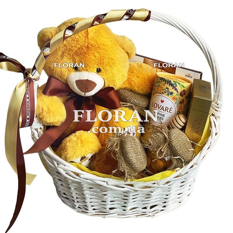 Candy and tea basket - product code FL-2019 - is the epitome of sweet moments and cozy tea parties. We have collected for you the most exquisite treats to give you and your loved ones an unforgettable experience. In this magical basket you will find exquisite Merci and Ferrero Rocher chocolates that captivate with their unique taste and delicate textures. They will bring a touch of luxury and pleasure to your home. To make your tea drinking even more delicious, we've added loose leaf tea to your basket - the perfect addition to your sweet treats. And honey and jam will give the tea a unique aroma and taste. The bear, which is so affectionately nestled in this basket, will be your faithful companion during hours of relaxation and pleasure. A gift basket with sweets and tea is an opportunity to create a real holiday at any moment. Share this deliciousness with your loved ones and enjoy moments of joy together.