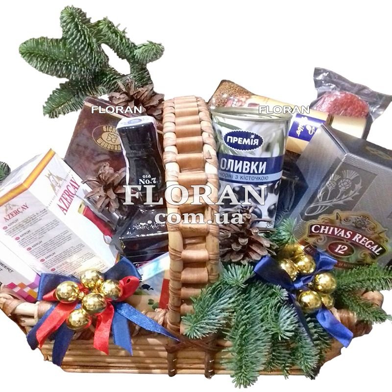 Jack Daniel's whiskey 0.5 l (as a gift), Chivas Regal whiskey 0.5 l (as a gift), green tea - 1 pc., instant coffee 100-120 g - 1 pc., box of sweets 140-150 g, box of Lyubimov candies 125 g or other candies, chocolate bar - 4 pcs., olives - 1 pc., raw smoked sausage stick - 1 pc., hard cheese - 1 pc., spruce or pine branches (from December 6 to December 31)