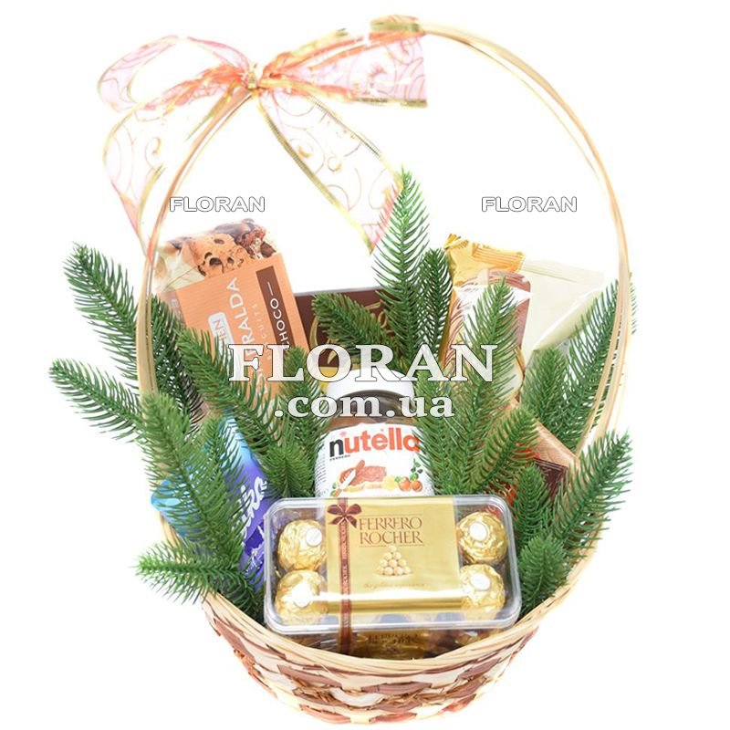 Christmas gift basket - product code FL-606. This small but charming gift basket for Christmas and New Year will be a wonderful surprise for your loved ones. Inside, you'll find all sorts of melt-in-your-mouth goodies - Ferrero Rocher favorites, Nutella's smooth chocolate spread, a sponge roll, a package of biscuits, and a few chocolate bars.