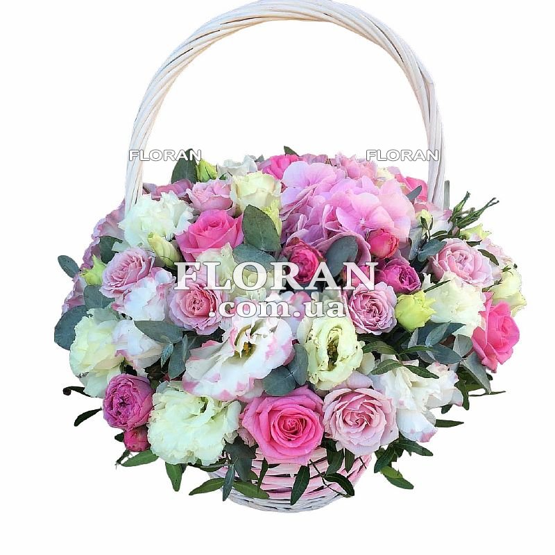 Composition in the basket - product code FL-625. This exclusive hydrangea flower basket is a great choice for those who are looking for an unusual and bright gift. It combines elegant white roses, delicate eustoma and large blue hydrangea, which is the main accent of the composition. The blue shade of hydrangea gives the bouquet a special charm and creates an atmosphere of lightness and freshness. Additional elements of the basket are gypsophila and greenery, which complement the composition and give it a more complete and complete look. This bouquet in a basket is perfect for many occasions such as birthdays, anniversaries, wedding anniversaries or just as a symbol of attention and love.
