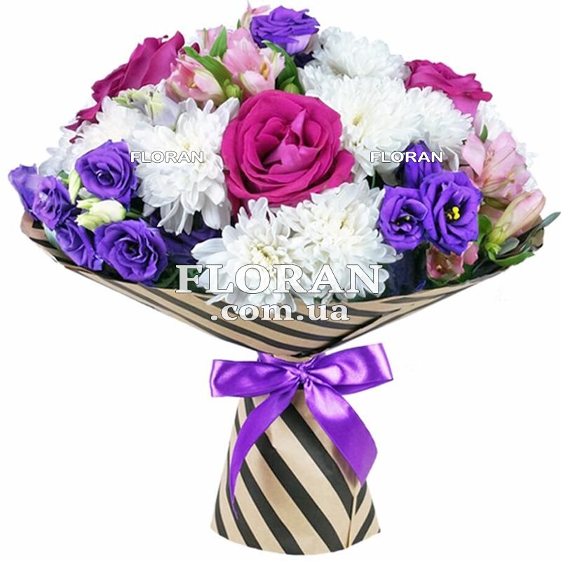 - 5 purple eustomas. Purple eustoma is a symbol of nobility, elegance and mystery. They will add mystery and sophistication to your bouquet.