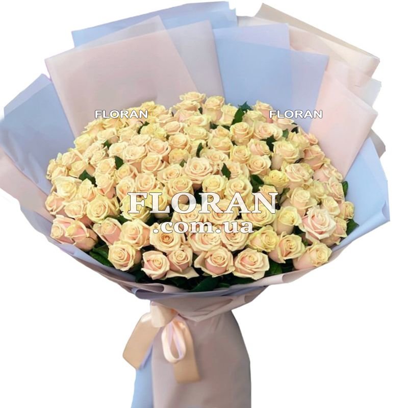 Custom bouquet of flowers - product code FL-2784 - is a real work of art that stands out for its uniqueness and creative approach. Here are some ways to interpret and use this bouquet: An original gift: This bouquet is suitable for those who appreciate unusual and extravagant gifts. This is a statement of your care and originality in choosing gifts. Apology and Reconciliation: 85 cream roses can serve as a symbol of your sincere desire to correct a mistake or make peace with someone. They speak of your honest intentions and peaceful spirit. Decor: This custom bouquet can be a decoration for a special event such as a wedding, anniversary or corporate event. It will attract attention and give the event a special style. Support and Inspiration: This bouquet can serve as a source of inspiration and energy for those close to you. It expresses your deep concern and support. Don't forget to take advantage of our delivery service to make this custom bouquet even more impressive for the recipient.