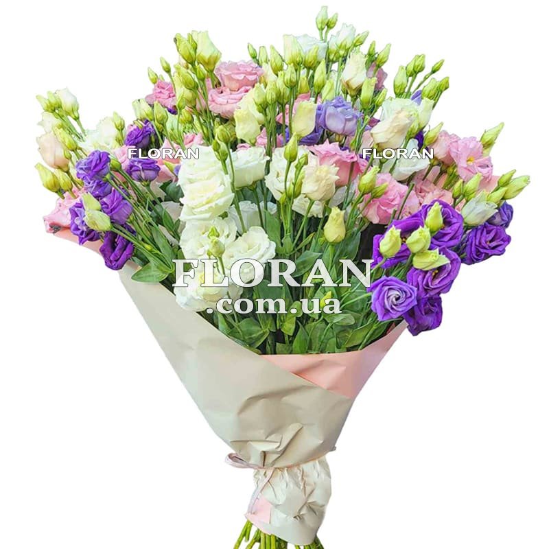 Give this package with multi-colored eustomas with a wish of joy, prosperity and beauty. It is suitable for loved ones, friends or colleagues whom you want to please and bring a bright accent to their lives.