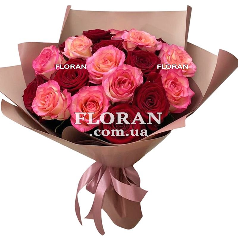 Exclusive bouquet of fresh flowers - product code FL-2819 - a real work of art of nature. It consists of 21 red roses and Jumilia roses, and each flower in it is like a picturesque painting of nature. The red rose is a symbol of passion, love and respect, and the Jumilia rose with its unusual shape and unique petals gives this bouquet unique beauty and originality. This bouquet is the perfect solution for special occasions and important moments in life. It can be a sign of love and commitment in a romantic relationship, an anniversary or birthday gift, or to express deep feelings for someone special. Red roses have always been a symbol of passion and attraction, and this bouquet will enhance your message. Our flower shop provides a delivery service to make your gift even more memorable and comfortable. We guarantee high-quality and timely delivery so that your bouquet of fresh flowers conveys your message and delights the recipient. This exclusive bouquet will emphasize the importance of the moment and add bright emotions to any celebration or meeting.