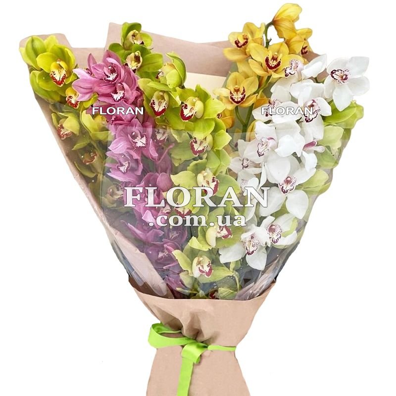 Extraordinary bouquet of flowers - product code FL-1640 - with seven multi-colored orchid branches and packaging, is a truly unique choice for a special occasion or to please a special person. Multi-colored orchids will create a bright and picturesque composition, each branch with a unique combination of colors that reflect the beauty and diversity of nature. This bouquet of flowers will attract attention with its uniqueness and beauty. Orchids are a symbol of luxury, sophistication and refined taste. Their bright and vibrant shades give the bouquet a special appeal and elegance. Packing the bouquet will ensure its safety and protection during transportation. We pay attention to every detail so that your bouquet is presented in a beautiful way. You can order this unusual bouquet of flowers with orchids in our store with delivery to any city in Ukraine. We guarantee the quality of our flowers and timely delivery. Delight a special person with this exotic bouquet that will express your originality and love for him.