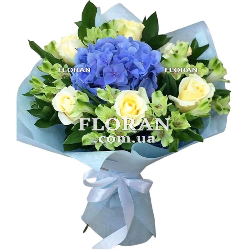 This bouquet of blue hydrangeas, white roses and alstroemerias will be a wonderful gift for a boy. It expresses tenderness, friendship and joy, and will be a pleasant surprise for your recipient.