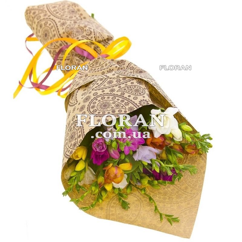 Freesia in a bouquet - product code FL-400. Freesias are flowers that are always associated with spring and summer. A small bouquet of 11 freesias is a great way to express a sign of attention or make a pleasant surprise for a child. Each freesia in this bouquet reminds us that even small things can bring joy and happiness. Beautiful flowers with bright petals and delicate aroma will please the eye and create a cozy atmosphere in any room. This small but very cute bouquet will be a wonderful gift for those who love simplicity and beauty in life.