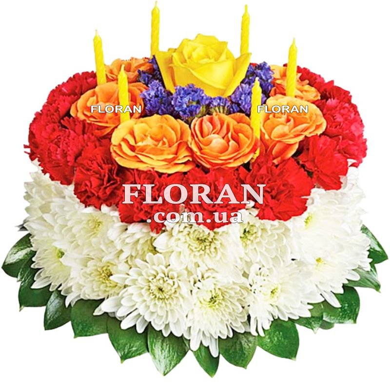 Fresh flower cakes for children - product code FL-272. Do you want to please your child on his or her birthday? Then a flower cake is just what you need! Our cake consists of 1 yellow rose, 9 orange roses, 15 red carnations, 6 white bush chrysanthemums, candles and a floral base. This is not just a bouquet of roses, chrysanthemums and carnations, it's a real flower cake that will delight your child and their guests.