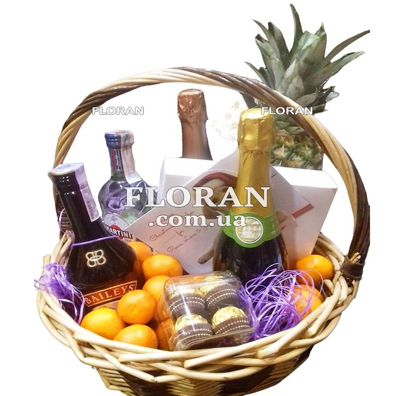 Gift basket for Christmast – product Code FL-2094. A Christmas gift basket filled with colorful and delicious treats is a true symbol of the warmth and joy of the holiday. This basket contains unique delicacies that will give you an unforgettable taste of Christmas. Pineapple and tangerines are fresh and juicy fruits that symbolize festive abundance and joy. Ferrero Rocher and Rafaello sweets will add a touch of luxury and sophistication to your holiday. Baileys liqueur and Martini Bianco vermouth will allow you to enjoy the moment and add a touch of comfort and warmth. Sparkling wine produced in Ukraine will emphasize the special atmosphere of Christmas and give a sparkling taste of the holiday. This hamper is perfect for a family Christmas celebration where you can enjoy delicious treats and nice drinks with your loved ones. Give this Christmas Gift Basket to share the joy and taste of this magical day with your friends and family. This gift will become a bright accent of your holiday and will give you many unforgettable moments.