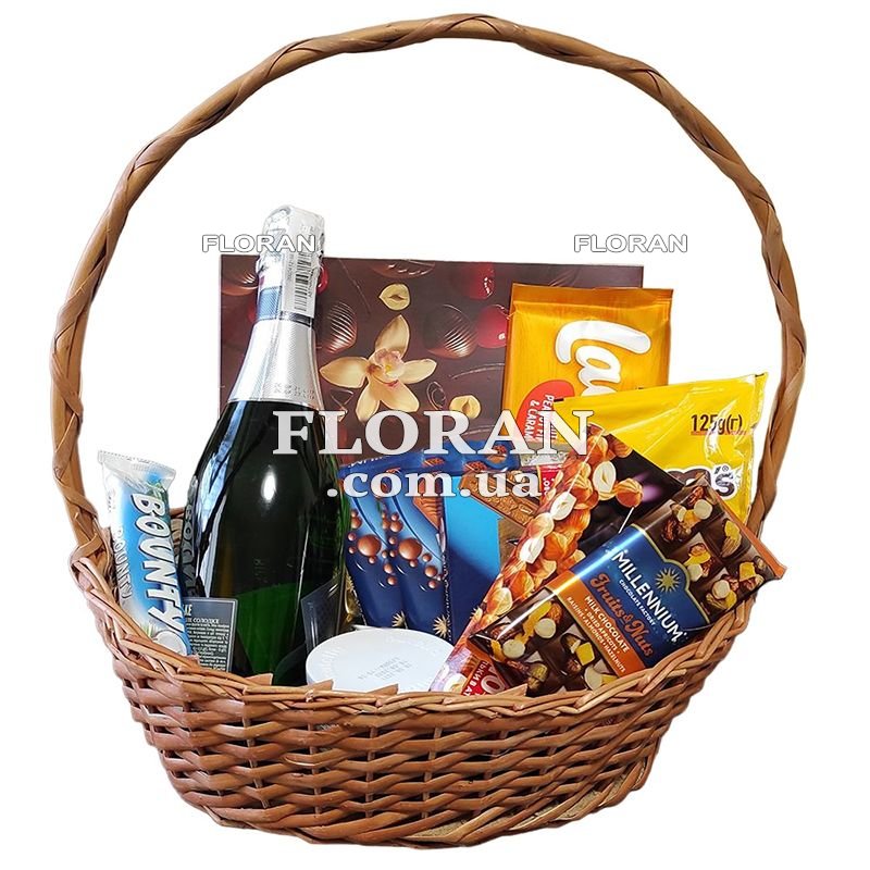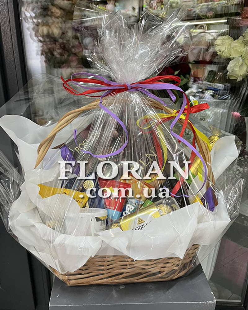 Gift basket with chocolate - product code FL-2021 - this is tenderness and joy captured in every treat. Inside this basket are hidden the most exquisite sweets that can warm the soul and improve mood. A magnificent box of sweets, a large bar of the most delicate chocolate, as well as an assortment of chocolate treats and chocolate paste - this is a real treat for lovers of sweets and chocolate. Each chocolate element of this basket will bring inexpressible pleasure and enhance your moments of bliss. A basket of chocolates is a universal gift. It can become a manifestation of gratitude to the employee for his great merits, a gentle congratulation to your mother on the day of the angel, as well as a symbol of your love and care for your wife on your wedding anniversary. This gift can give warmth and comfort at various moments of life, because sweet joys are always relevant.