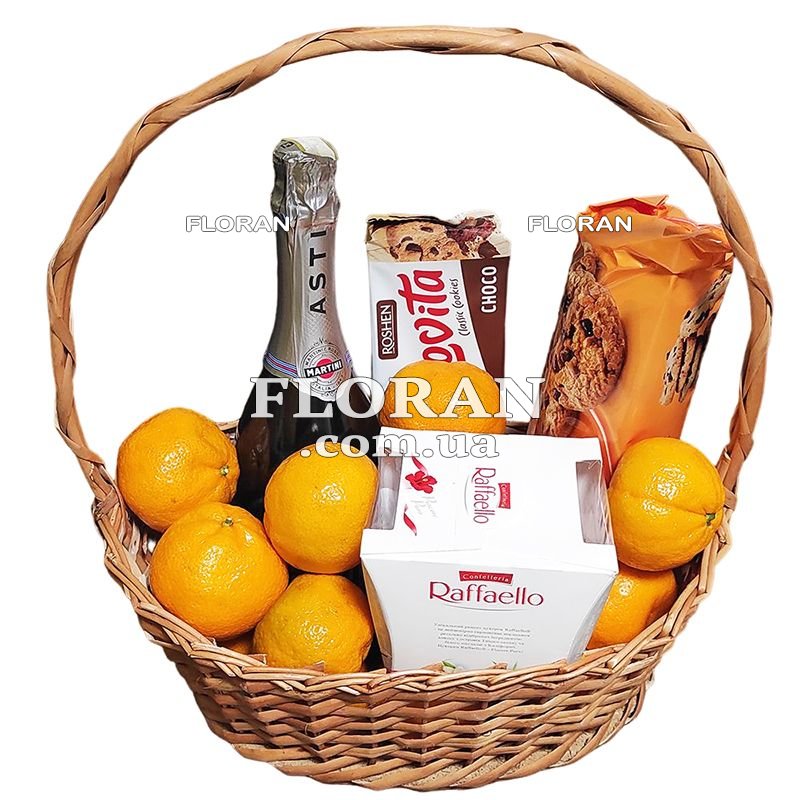 Gift basket with sweets - product code FL-2064 - is a real find for those who appreciate bright and tasty gifts. Inside you will find delicate Raffaello sweets, as well as fragrant cookies, which will be a great addition to a cup of tea or coffee. But that is not all! You will also be pleased with ripe tangerines or oranges, which are always relevant and bring joy with their bright taste and aroma. And to make this gift even more special, there is Martini Asti sparkling wine in the basket. It will add a festive mood and make the moments of meetings even more solemn. This gift is perfect for friends, colleagues, and even family. This basket will decorate any holiday and give vivid impressions. Don't miss your chance to please your loved ones with such a tasty and stylish gift!