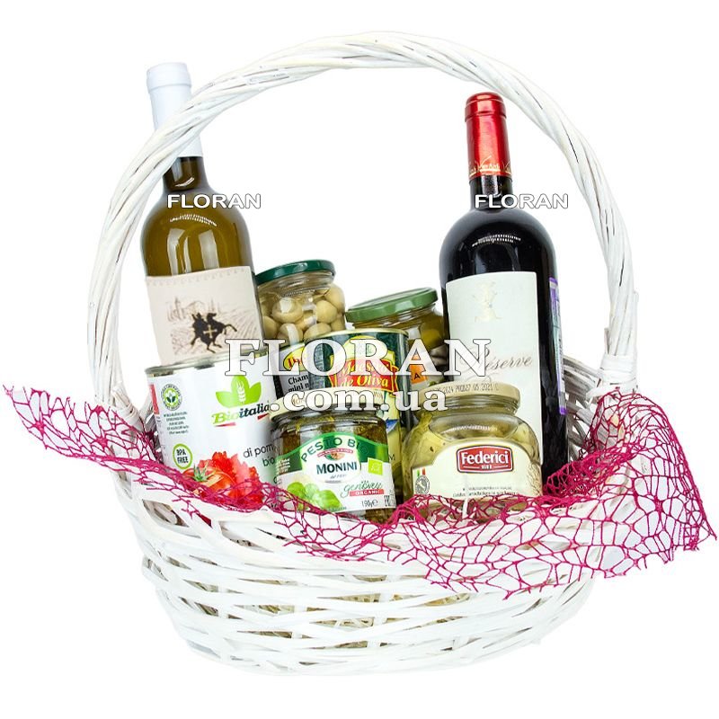 Gift basket with wine - product code FL-1958. This wine gift basket contains a variety of delicacies that will surely delight the recipient and create a special atmosphere of comfort and celebration. Pickled cucumbers, mushrooms, olives and black olives are gourmet snacks that are ideal for wine gatherings or an evening in good company. Tomato paste and sauce are excellent ingredients for preparing delicious and aromatic Italian dishes that can satisfy the most sophisticated taste. And, of course, imported wines from Italy, France or Spain are a real masterpiece of world winemaking. Red and white wine will inspire a true wine connoisseur and create an atmosphere of celebration and fun. Our wine gift basket represents a real wine journey that will bring pleasure and joy. It is ideal for various festive events, parties, or just to give joy and a smile to your loved ones. Delivery is available to many cities in Ukraine to make the purchase process as convenient and enjoyable as possible for you. Delight your loved ones with this exquisite wine gift basket and enjoy moments of taste and joy together!