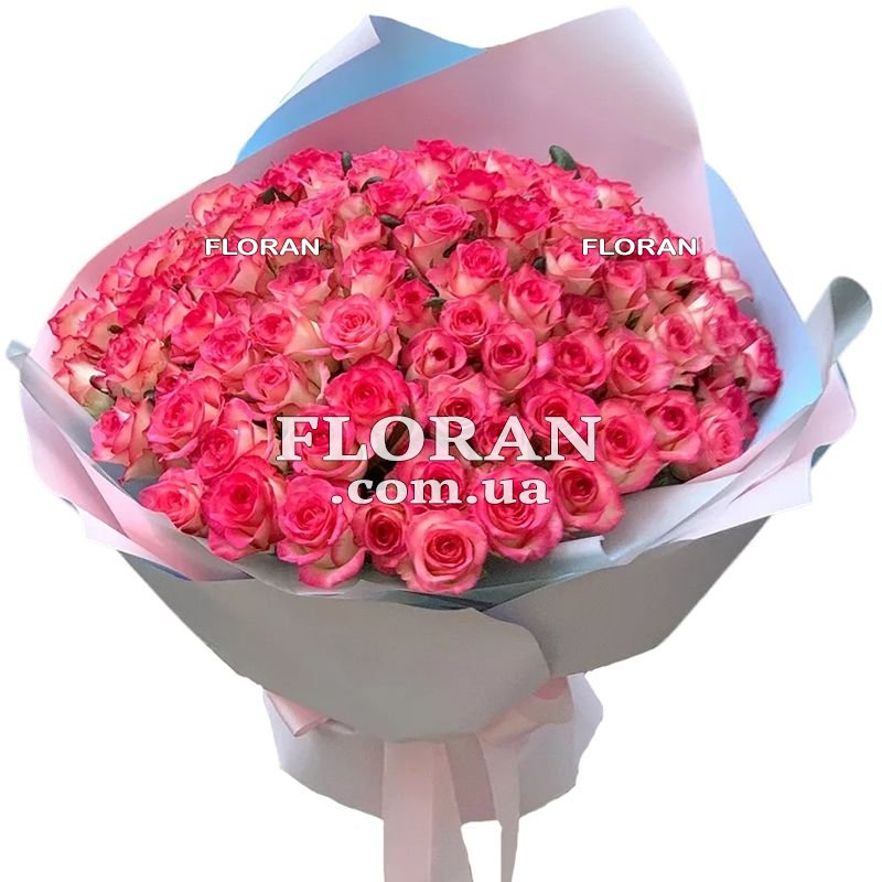 Large bouquet of flowers - product code FL-2749 - is not just flowers, it is a real work of art that can evoke a lot of emotions and joy in the recipient. Pink Jumilia roses have a special splendor and delicacy, and they are a symbol of sublime love, gratitude and respect. This bouquet is ideal for expressing your feelings for a loved one, especially a woman you value and respect. Pink roses symbolize tenderness and harmony, and they fit perfectly into various events and occasions such as Birthdays, Anniversaries, Valentine's Day, Weddings or simply as a token of affection in everyday life. In addition, our delivery service is ready to deliver this magnificent bouquet to any corner, at any time, which will allow you to please your recipient, wherever he is. A large bouquet of roses is a wonderful way to give bright and unforgettable moments of joy and happiness.