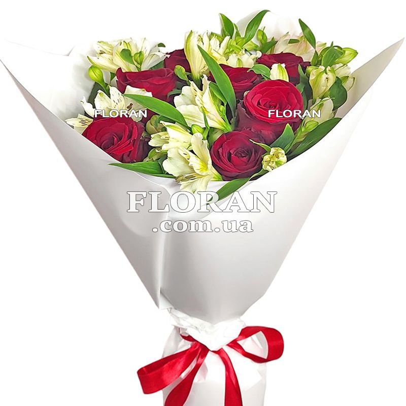 - 8 white alstroemerias. White alstroemerias are delicate and graceful flowers that symbolize purity, innocence and elegance. They will add freshness and brightness to the bouquet.