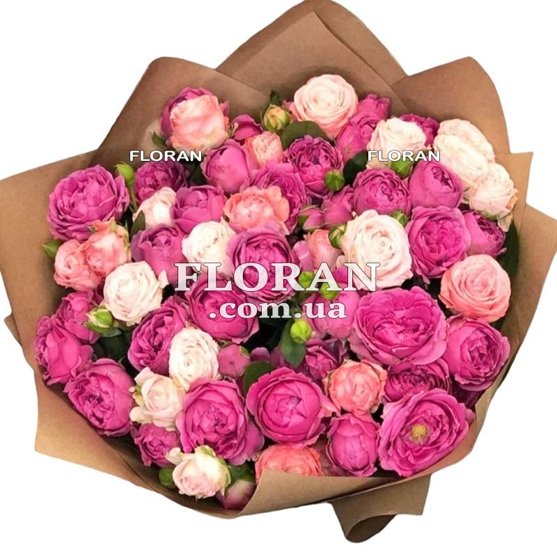 Mixed bunch of spray peony roses - product code FL-1394 - is the perfect combination of beauty and grace. This bouquet contains 19 pink and creamy spray peony roses, creating a bright and impressive image. Shrub peony roses are flowers that attract attention with their beautiful petals and graceful shape. Their large and lush flowers represent luxury and elegance. Each rose in this bouquet has its own unique charm and appeal. Pink and cream shades of roses create a delicate and romantic image of the bouquet. They complement each other, creating a harmonious combination of colors and shades. A bouquet of a mix of spray peony roses expresses tenderness, love and admiration. The packaging of this bouquet completes it and protects the flowers during delivery. She emphasizes the beauty and value of each rose, making the bouquet even more attractive and presentable Receiving this bouquet will be a special moment that will be remembered for a long time. It will delight the eye with its brightness and attractiveness, creating an atmosphere of warmth and delight. A bouquet of mixed peony roses is the perfect gift for any special occasion or for the special person in your life. This bouquet will be a symbol of your admiration, love and respect. It will remind the recipient of your care and attention, bringing joy and a smile. A bouquet of a mix of spray peony roses will give moments of beauty and elegance, remaining in the heart for a long time.