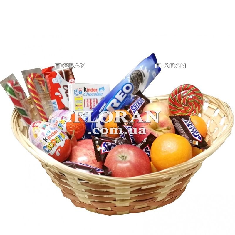 oranges, apples, tangerines, pomegranate or other seasonal fruit - 1 pc., Kinder Surprise chocolate egg - 2 pcs., chocolate Kinder Chocolate, Kinder Bueno bar or other chocolate bars, cookies 60-90 g, lollipop - 3 pcs., candy by weight 7 pcs.