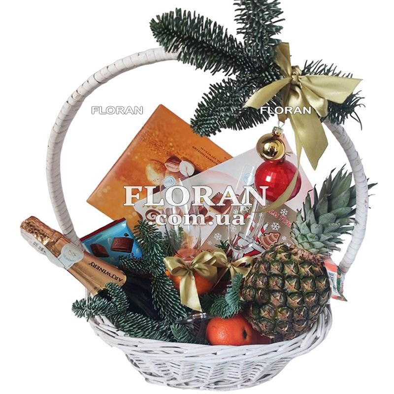New Year's gift basket - product code FL-2102 - a real fairy tale, packed in bright colors and delicious delicacies. It's perfect for greeting friends, family and colleagues this magical holiday season. Pineapple and tangerines, bright and juicy, give this basket a special taste and aroma of Christmas. Boxes of chocolates are varied in content, which adds a zest to this gift - they contain sweet secrets that will bring joy and pleasure. The chocolate bar is a true festival of chocolate bliss. Champagne and two glasses are ready to raise a glass to health and joy on this festive evening. Spruce or pine branches create a festive atmosphere and add coziness. This New Year's gift basket is the ideal way to congratulate loved ones and make the holiday unforgettable. Share delicious moments of joy and magic with this hamper and let it brighten up your Christmas.