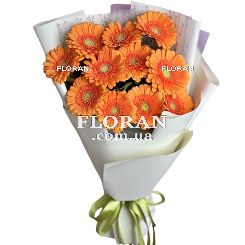Orange gerberas in a bouquet - product code FL-1576 - is a bright and energetic gift that personifies joy, warmth and optimism. Orange gerberas symbolize enthusiasm, vitality and positive mood. They can be the perfect choice for a bouquet meant for a loved one, friend or loved one. The orange color of gerberas is associated with bright sun, flames and warm flames. It brings a sense of joy, inspiration and energy, which makes this bouquet a great way to cheer up and express your love and gratitude. The packaging of the bouquet also plays an important role in creating the overall impression. You can choose the packaging that goes best with orange gerberas, such as a clear wrapper or bright orange packaging to highlight their color combination and appeal. You can also add a ribbon or bow for an extra touch. A bouquet of 11 orange gerberas is a wonderful gift for various occasions and holidays. It can become a symbol of the beginning of a new chapter, a wish for success, or simply an expression of warm feelings. This bright and energetic bouquet will put a smile on the face of the recipient and bring joy to his life. Don't forget to attach a personal message or card to the bouquet to express your feelings and wishes to the recipient. A bouquet of 11 orange gerberas is a great way to show that you care and think about him and convey your love and support.