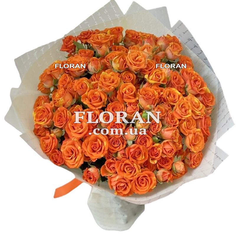 Orange rose bouquet - product code FL-1381. Imagine an amazing bouquet of 25 orange spray roses. Orange color symbolizes energy, passion and warmth, and this bouquet perfectly conveys all these feelings. Orange spray roses have a bright and attractive color that attracts the eye and evokes positive emotions. They look beautiful and fresh, and their petals emit a pleasant aroma. Packed in an elegant package, this bouquet will be a wonderful gift for a special person. It will bring joy and warmth to the life of the recipient, allowing him to feel your care and attention. A bouquet of 25 orange spray roses will be a great accent in any interior and create an atmosphere of joy and comfort. It is ideal for various special occasions, whether it is a birthday, anniversary, achievement celebration or just to express your love and recognition.This bouquet will become a vivid symbol of your love and admiration, remaining in memory for many years and reminding you of your care and devotion.