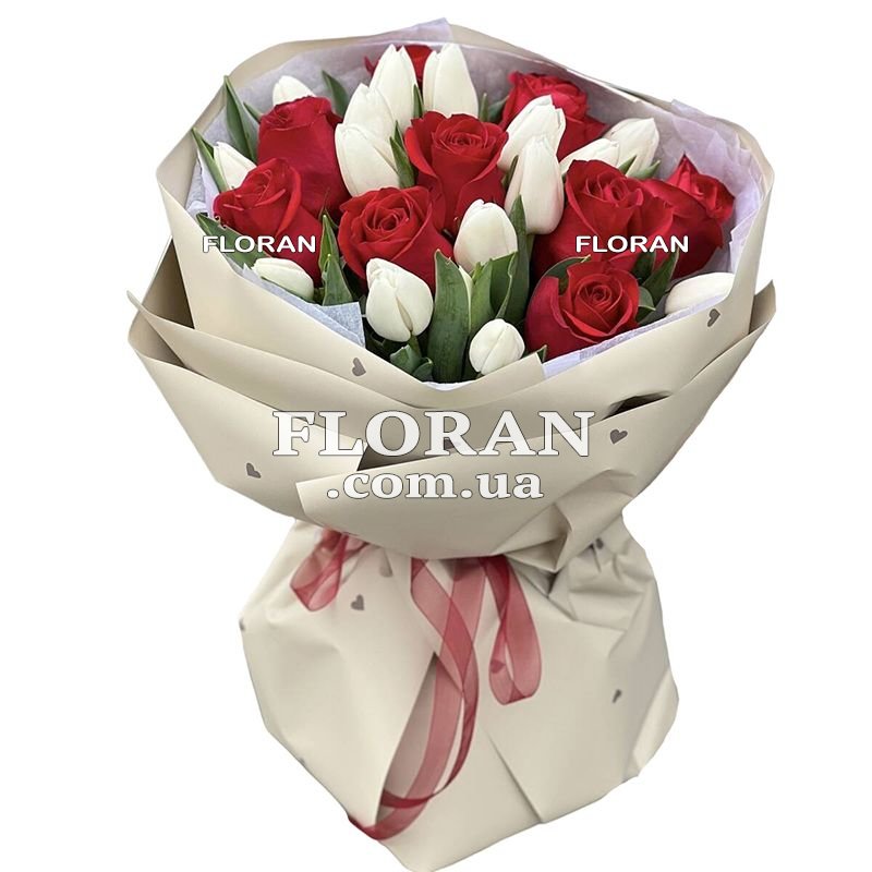 Red roses and white tulips - product code FL-2441 - is an elegant and stylish combination of two beautiful types of flowers. It can carry different symbolic meanings depending on the context and your personal feelings. Here are some interpretations of this bouquet: Romantic Love: Red roses are traditionally associated with deep passion and romantic love. White tulips symbolize innocence and purity of feelings. This bouquet can be a sign of hot and pure love. Freshness and a new beginning: White tulips are often associated with the beginning of something new and purity. Red roses can add an element of passion and emotion to this new beginning. This bouquet could be the perfect gift to start a new chapter in your relationship or life. Respect and Appreciation: White tulips can also symbolize respect and appreciation. A combination with red roses can signify deep and sincere gratitude. Simply a beautiful bouquet: Regardless of the symbolic meaning, this bouquet can simply be seen as a beautiful and impressive gift. The packaging ensures its safety and adds beauty. It is important to remember that flowers can be collected and interpreted differently depending on culture and personal preference. The choice of bouquet and its meaning is left to your discretion and can be tailored to the specific occasion and relationship.