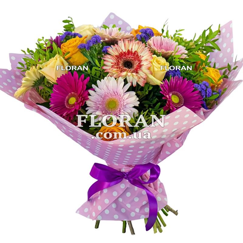 Roses with gerberas - product code FL-1144 - a delightful combination of elegance and tenderness, creating an impressive image. This bouquet uses 9 colorful gerberas and 10 yellow roses, as well as greenery to add freshness and natural beauty. Packaging is also included to complete the overall look of the bouquet. Yellow roses are a symbol of joy, friendship and optimism. Their warm and sunny hue brings a sense of light and joy to the bouquet. Each rose has its own unique beauty, and a group of yellow roses when assembled creates a magnificent sight and brings a feeling of happiness and positive mood. Multicolored gerberas, with their bright and rich petals, add playfulness and color to this bouquet. Each gerber has its own unique shade, and their diversity creates a vibrant and attractive combination of colors. Gerberas symbolize joy, youth and optimism, and their presence in the bouquet adds cheerfulness and freshness. The greenery included in the composition of the bouquet gives it additional harmony and naturalness. Leaves and twigs of greenery frame the roses and gerberas, creating a pleasant contrast and giving the bouquet a sense of natural beauty. They also add freshness and volume to the bouquet, making it more interesting and elegant. Bouquet packaging is an important element of its design. A bouquet of 9 multi-colored gerberas, 10 yellow roses with greenery and packaging is a great choice for those who want to give their loved ones a little happiness.