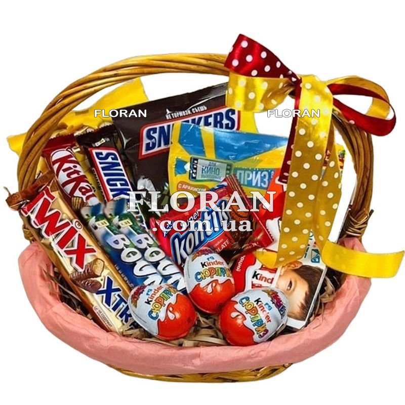 Small candy basket - product code FL-2063. This little basket contains real tasty treasures! It is perfect as a small gift for loved ones or just for your own enjoyment. Sweet Snickers, chocolate M&M's and Kinder Chocolate, delicate sweets and cheerful Kinder Surprise - all this will provide you with incredible pleasure in one basket. Candies, bars and cookies add variety to this sweet assortment. They are suitable to satisfy the most refined taste preferences. This little candy and sweets basket is a great way to treat yourself or your loved ones any day. It can be ordered easily and quickly through our website or instant messengers. Our couriers will deliver it to you wherever you are, so you can enjoy the sweet moments of life with this wonderful basket. Share the joy and taste with those you love with this small but magical candy basket!