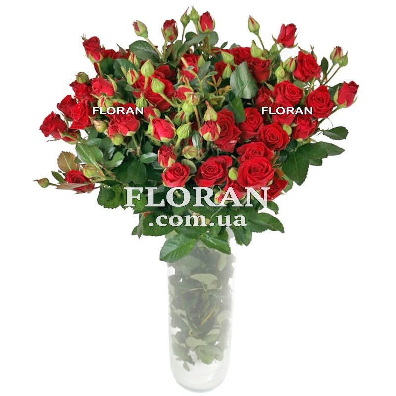 Small red roses - product code FL-1375 - are a great choice for creating a luxurious and passionate bouquet. This composition contains 19 red spray roses, which in themselves are a symbol of love, passion and beauty. These small roses attract attention with their rich red color and bright petals. Their delicate buds create a beautiful contrast with the greenery of the stems and leaves, adding a special charm and elegance to the bouquet. Red roses have long been associated with love, passion and romance, so a bouquet of 19 red small roses makes a wonderful gift for lovers, especially on special occasions such as Valentine's Day or an anniversary. This bouquet will create an atmosphere of passion and romance, allowing you to express your feelings and emotions. It will be a bright and unforgettable symbol of love and will attract attention with its beauty and sophistication. Packed with care and love, this bouquet of red small roses will be a great gift for a special someone. It will express your passion and devotion, as well as emphasize the importance of this moment.