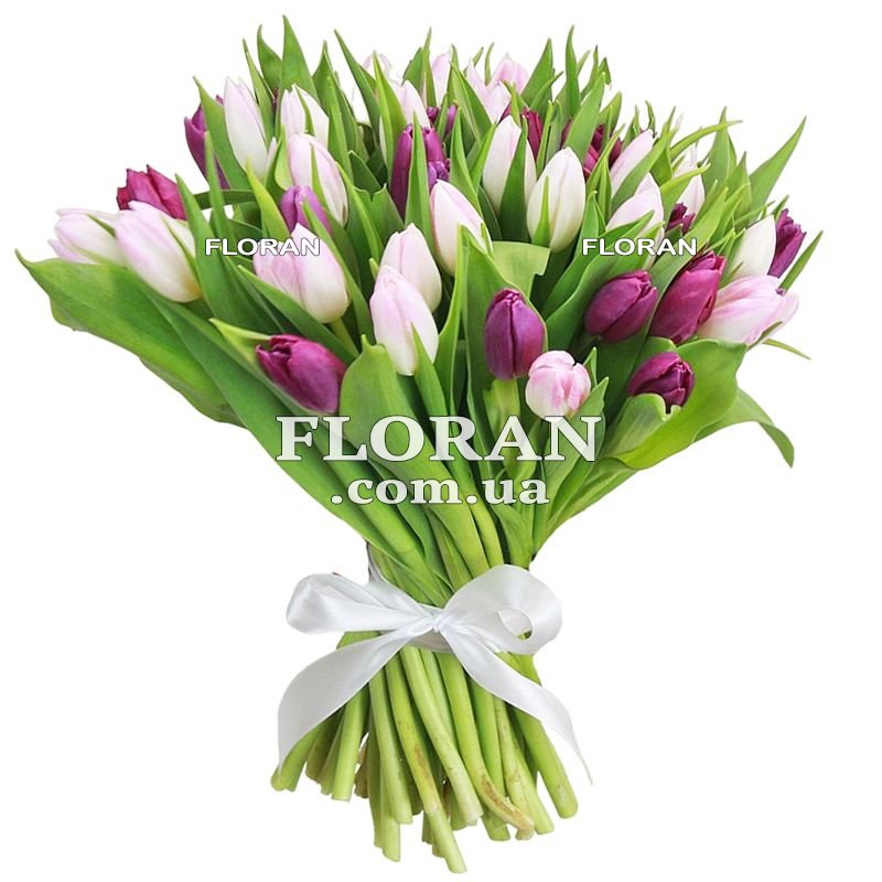 Spring bouquet of tulips - product code FL-2425 - is a gentle and joyful manifestation of your care and warmth for your loved ones. Tulips are a symbol of spring and renewal, and this bouquet perfectly captures the freshness and beauty of this time of year. Pink tulips are often associated with tenderness, harmony and love. They are ideal for birthday greetings, wedding gifts, or simply expressing your feelings. Purple tulips symbolize mystery and respect. This bouquet can also be a wonderful gift for International Women's Day or any other spring holiday. Bright and fresh colors will create an atmosphere of celebration and joy. With packaging or ribbon, the bouquet will look even more impressive and complete. If you wish to place an order anonymously, our delivery service guarantees anonymity and will help you pleasantly surprise your recipient.