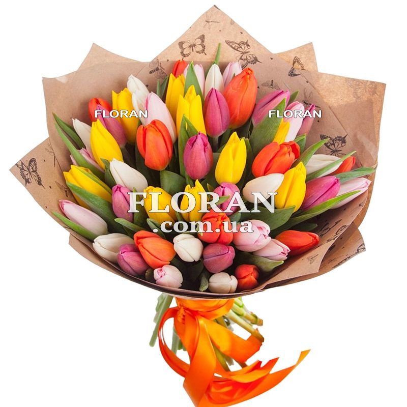 Tulips in a bright bouquet - product code FL-2419 - this is a real visual and emotional palette of joy and life. Multi-colored tulips symbolize diversity, happiness and friendship, and this bouquet can be an amazing gift for someone you want to delight. Red tulips in a bouquet express passion and true love, yellow tulips express joy and happiness, and other bright colors add fun and optimism. A bouquet, packaged with care and love, can be a gift for a birthday, anniversary, wedding, or just to bring joy on an ordinary day. This bouquet emphasizes the diversity of feelings and emotions, which makes it a universal and picturesque gift. The packaging of the bouquet ensures its safety and beauty upon delivery, so that your gift will definitely reach the recipient in the best possible condition.