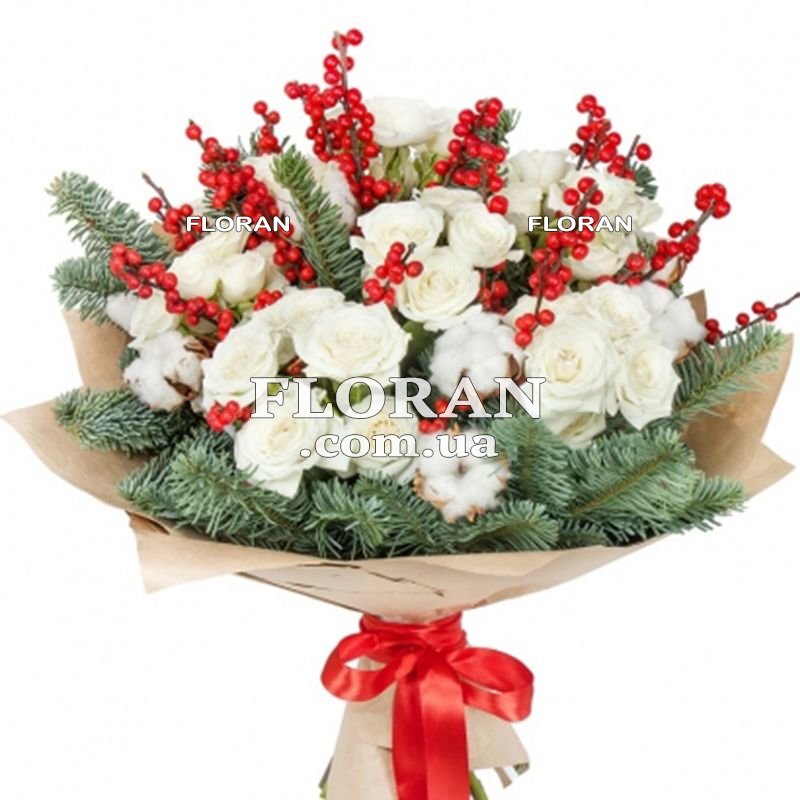 Winter bouquet with white spray roses - product code FL-2220. Winter brings with it magic and purity, and this winter bouquet of white spray roses embodies all its beauty. This bouquet contains 9 delicate white spray roses, which symbolize the purity and freshness of the first snow. They are complemented by 8 heads of cotton, creating an atmosphere of softness and tenderness characteristic of winter days. Red ilexes give the bouquet a bright accent and remind us of the holiday that awaits us. A winter bouquet with white roses is a sign of tenderness and attention. It's suitable for any occasion, be it a romantic gesture to your sweetheart, a gift for your mom or girlfriend, or just a way to express your gratitude. Our couriers deliver to any city in Ukraine, which allows you to make this wonderful winter bouquet a gift for your loved ones, regardless of where they are. Don't miss the opportunity to give a piece of a winter fairy tale with this wonderful bouquet.