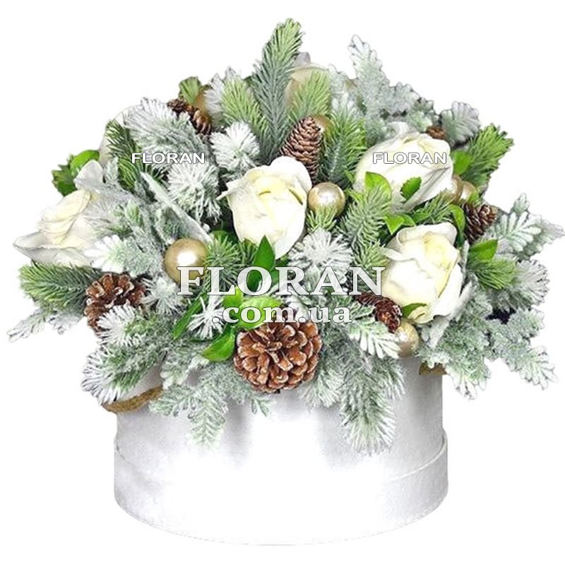 Winter composition in a box - product code FL-2189. Winter is an amazing time of year, when the world is wrapped in a white blanket of snow, and an atmosphere of magic and anticipation of a miracle is in the air. This is the time of year when our hearts are filled with joy and warmth, and the upcoming New Year holidays add bright moments to our lives. At this moment, it is especially pleasant to give and receive gifts, because they symbolize care and attention. A winter arrangement in a box is not just a bouquet of flowers, but a real symbol of this magical time. It combines snow-white roses, which symbolize snow-covered fields and gardens, as well as Christmas tree balls and cones, reminiscent of the upcoming New Year. The box in which the composition is presented serves as the basis for this amazing winter fairy tale. By giving such a composition to your loved ones or friends, you are giving them a piece of winter magic and joy. This gift can decorate the interior and give comfort in the home, as well as remind you of loved ones and festive moments. It is suitable for both home interiors and office spaces, creating an atmosphere of joy and anticipation of the holiday. Arrangements in a box are an amazing opportunity to give beauty and joy, as well as express your best wishes. An important point is also the possibility of delivery, which our New Year's compositions store provides. No matter where your recipient is, we will deliver the gift to where they are eagerly awaiting it. From wreaths to tabletop arrangements, we offer a variety of arrangements to suit your holiday needs. Thus, a winter arrangement in a box is not just flowers, it is a real portion of joy that will help create a unique atmosphere of magic and celebration in the home of your loved ones. Don't miss the chance to give them this amazing arrangement and make their winter unforgettable.