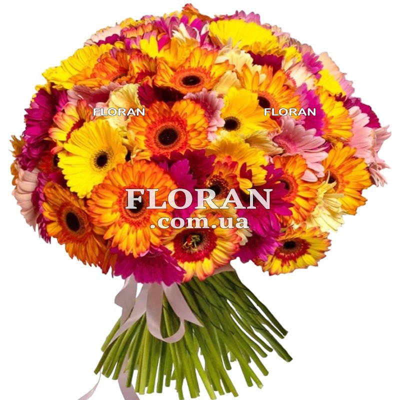 101 гербера - код товара FL-374. Большой букет из 101 разноцветной герберы - это незабываемый подарок, который оценит каждая женщина или мужчина. Такое количество цветов символизирует бесконечную любовь и уважение, что делает этот букет еще более особенным. Разнообразие цветов герберы - от белого до ярко-красного и фиолетового - позволяет создать эффектный и пестрый букет, который никого не оставит равнодушным. Этот букет прекрасно подойдет для таких особых случаев, как юбилей, день ангела или просто как проявление заботы и любви к близкому человеку. Кроме того, герберы долго сохраняют свежесть и являются прекрасным украшением для дома или офиса. Герберы - это цветы, которые всегда будут радовать своей красотой и яркостью.