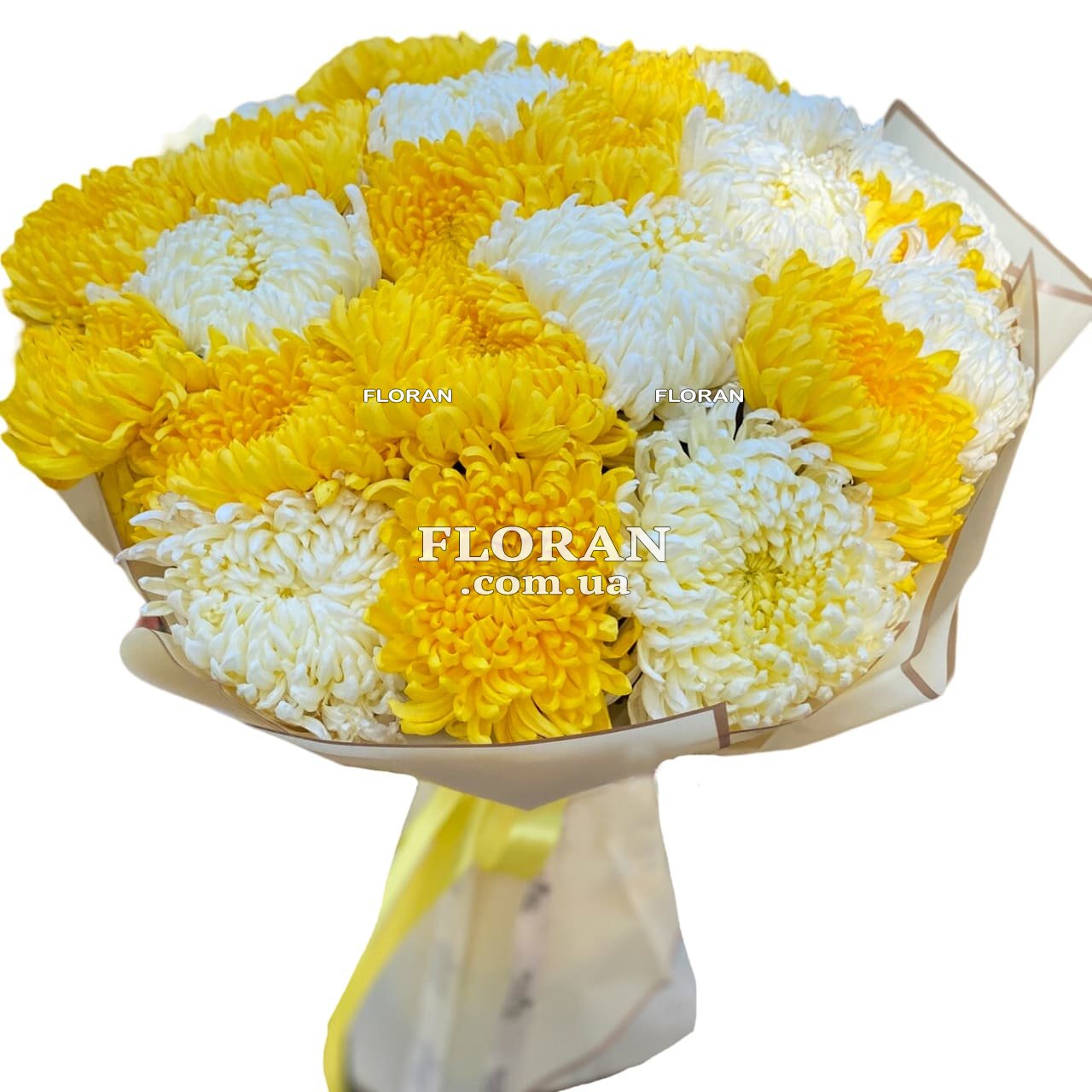 25 одноголовых хризантем - код товара FL-927. Представляю вам великолепный букет из 25 одноголовых хризантем, состоящий из белых и желтых цветов. Этот букет является идеальным сочетанием свежести, красоты и элегантности. Белые хризантемы символизируют чистоту, невинность и возвышенность. Они привносят свежесть и прекрасно подчеркивают элегантность букета. Белый цвет также олицетворяет новое начало и придает букету нежность.