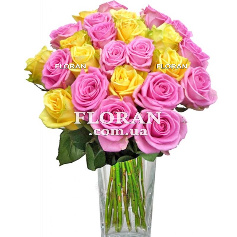 25 роз - код товара FL-713. Только вообразите великолепный букет из 25 розовых и желтых роз, который поражает своей яркостью и красотой. Этот букет станет прекрасным подарком для любого особого случая или просто для того, чтобы подарить радость и улыбку вашим близким. Розовые розы символизируют нежность, романтику и привлекательность. Они являются выражением вашей любви и прекрасного чувства, которое вы питаете к получателю букета. Желтые розы, в свою очередь, олицетворяют радость, дружбу и солнечное настроение. Они добавляют яркости и оптимизма в этот великолепный букет.