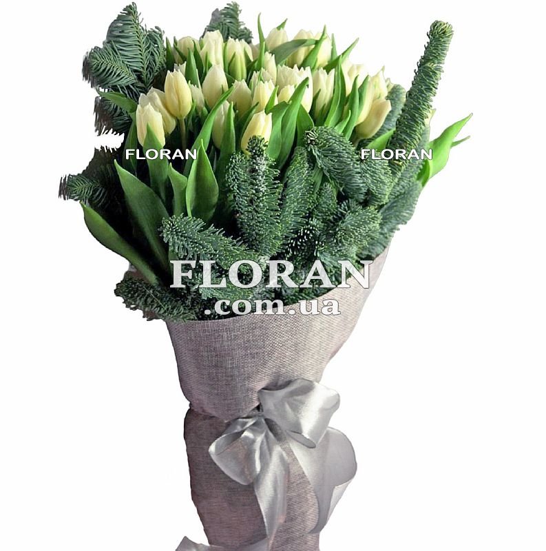 35 белых тюльпанов, ветки ели или сосны, упаковка