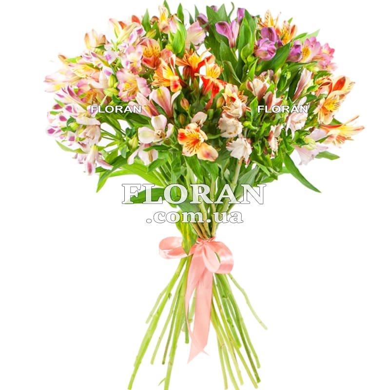 Альстромерии с лентой - код товара FL-835. Букет из 23 разноцветных альстромерий, перевязанных лентой, создаст яркое и насыщенное настроение. Каждый цветок разноцветный и прекрасно дополняет друг друга. Каждая альстромерия имеет свой уникальный оттенок, что делает этот букет особенным и неповторимым. Лента добавляет изысканности и завершает композицию. Такой букет отлично подойдет в качестве подарка для близких и друзей, а также как символ внимания и уважения к коллегам и партнерам.