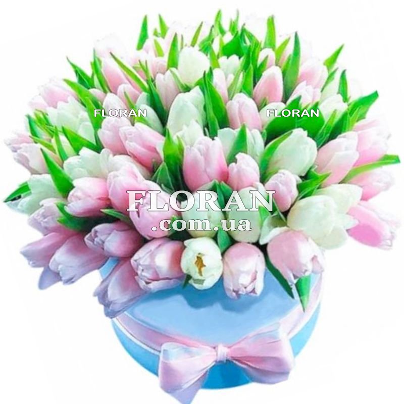 75 белых и розовых тюльпанов, коробка