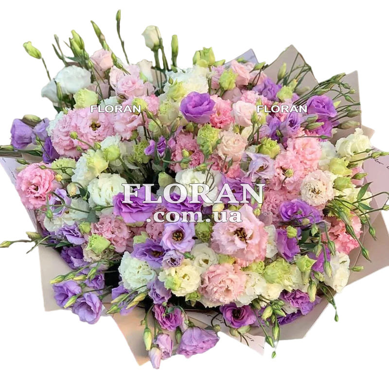 Большой букет эустома - код товара FL-987. Букет из 65 разноцветных эустом - это великолепное проявление красоты и разнообразия природы. Каждый цвет эустомы придает этому букету свою уникальность и создает впечатляющий цветовой ансамбль. В этом букете вы найдете разнообразные оттенки эустом, начиная от нежных пастельных тонов до ярких и насыщенных цветов. Он наполнен радостью, энергией и оптимизмом, которые символизируют эустомы.