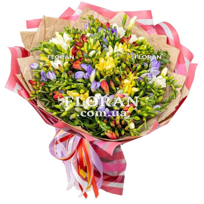 Большой букет фрезий микс - код товара FL-1604 - это яркое и впечатляющее цветочное произведение искусства. Он олицетворяет радость, жизненную энергию и красоту многообразия. Каждый цветок фрезии в этом букете будет словно яркая краска на холсте, создавая прекрасную палитру цветов и оттенков. Микс разноцветных фрезий добавляет в букет игривость, живость и ощущение праздника. Каждый цвет символизирует свои эмоции и чувства - от радости и веселья до нежности и любви. Этот букет подарит вам ощущение праздника и станет прекрасным подарком для любого особого случая или для того, чтобы просто порадовать своих близких. Упаковка букета обеспечит сохранность и безупречность каждого цветка фрезии. Она подчеркнет красоту и элегантность букета, а также придаст ему завершенность. Вы можете выбрать упаковку, которая соответствует вашему вкусу и предпочтениям, чтобы подчеркнуть особенность и уникальность этого яркого букета. Большой букет из 85 разноцветных фрезий станет великолепным подарком для любого особого случая - дня рождения, юбилея, свадьбы или просто для того, чтобы выразить свою любовь, благодарность или восхищение. Он станет центральным элементом в любом интерьере и заполнит пространство своим прекрасным ароматом и яркими цветами. Большой букет фрезий микс призван радовать глаз и сердце своей красотой и энергией. Он создаст атмосферу праздника, восторга и радости, а каждый цветок фрезии станет символом вашей заботы, внимания и любви к получателю. Неотразимый микс разноцветных фрезий в этом букете позволит вам выразить свою креативность и оригинальность в выборе подарка. Большой букет из 85 фрезий микс будет прекрасным дополнением к любому особому моменту в жизни или просто чтобы сделать день ярче и счастливее.