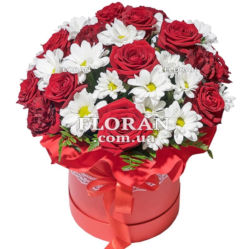 11 красных роз, 5 красных гвоздик, 5 белых хризантем, коробка