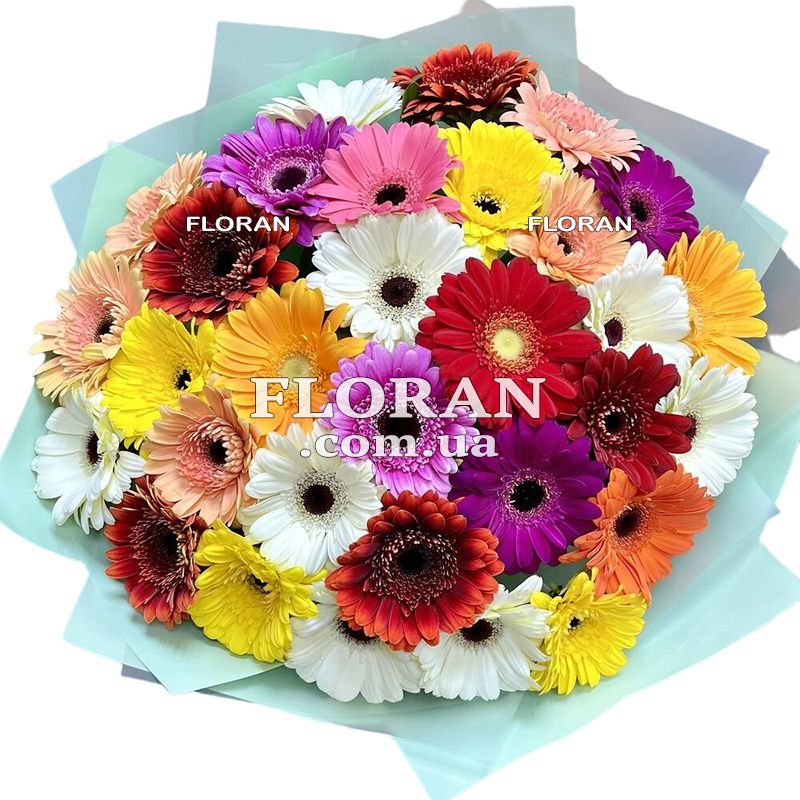 Букет цветов герберы - код товара FL-1546 - это воплощение радости, жизнерадостности и яркости. Каждая гербера своим насыщенным оттенком и великолепной формой лепестков привносит свежесть и энергию в эту композицию. 41 гербера в разнообразных цветах создают захватывающее зрелище, наполняя пространство букета своими яркими и сочными соцветиями. Они создают эффект радужной палитры, привлекая внимание своей разнообразностью и привлекательностью. Каждый цвет герберы имеет свой символический смысл, отражая радость, дружбу, любовь и благополучие. Этот букет гербер создан, чтобы вызвать улыбку на лице получателя и привнести красоту и позитив в его жизнь. Он идеально подойдет в качестве подарка на любой праздник, от дня рождения до юбилея или просто как проявление внимания и заботы. Разнообразие цветов герберы в этом букете демонстрирует его универсальность и способность подарить радость каждому получателю. Будь то друг, родственник или коллега, этот букет станет выражением вашей теплоты и добрых пожеланий. Наши флористы профессионально подбирают цветы, чтобы они долго радовали своим ярким видом и свежестью. Мы также предлагаем услугу доставки, чтобы вы могли удивить своих близких этим прекрасным букетом в любом уголке. Букет цветов герберы с составом из 41 разноцветной герберы - это источник вдохновения и радости, который подарит яркие эмоции и создаст незабываемую атмосферу. Подарите этот букет, чтобы подчеркнуть свою любовь, уважение и благодарность к вашим близким. Он точно порадует их сердца и оставит приятные воспоминания на долгие годы.