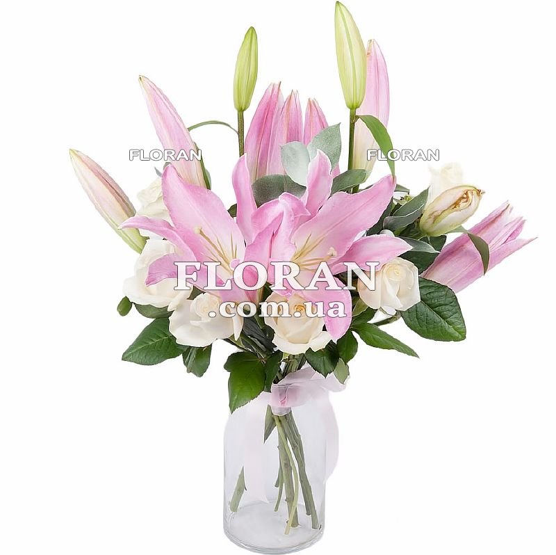 Букет цветов из роз и лилий - код товару FL-1134. Букет из 2 розовых лилий и 7 белых роз — это изысканное и романтичное сочетание цветов, которое создаст впечатление нежности и элегантности. Розовые лилии символизируют любовь, романтику и изысканность, в то время как белые розы являются символом чистоты, невинности и свежести. Розовые лилии, с их изящными и пышными цветками, придают букету особый шарм и элегантность. Они являются символом изысканности и утонченности, их насыщенный розовый оттенок привлекает внимание и вызывает восхищение. Лилии также ассоциируются с романтикой и страстью, что делает их идеальным дополнением к белым розам. Белые розы, в свою очередь, приносят в букет свежесть, чистоту и нежность. Они символизируют искреннюю и чистую любовь, что делает их популярным выбором для романтических подарков. Белый цвет роз также ассоциируется с невинностью и светлыми чувствами, что придает букету особую романтическую атмосферу.