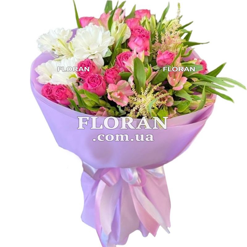 5 розовых кустовых роз, 1 белая хризантема, 7 розовых и белых альстромерий, упаковка