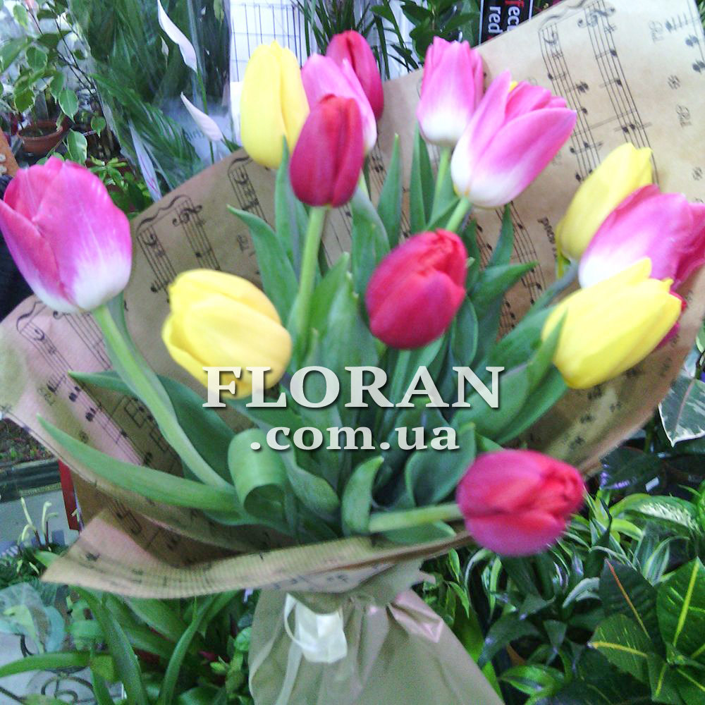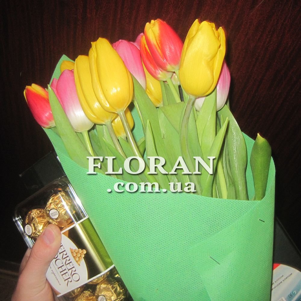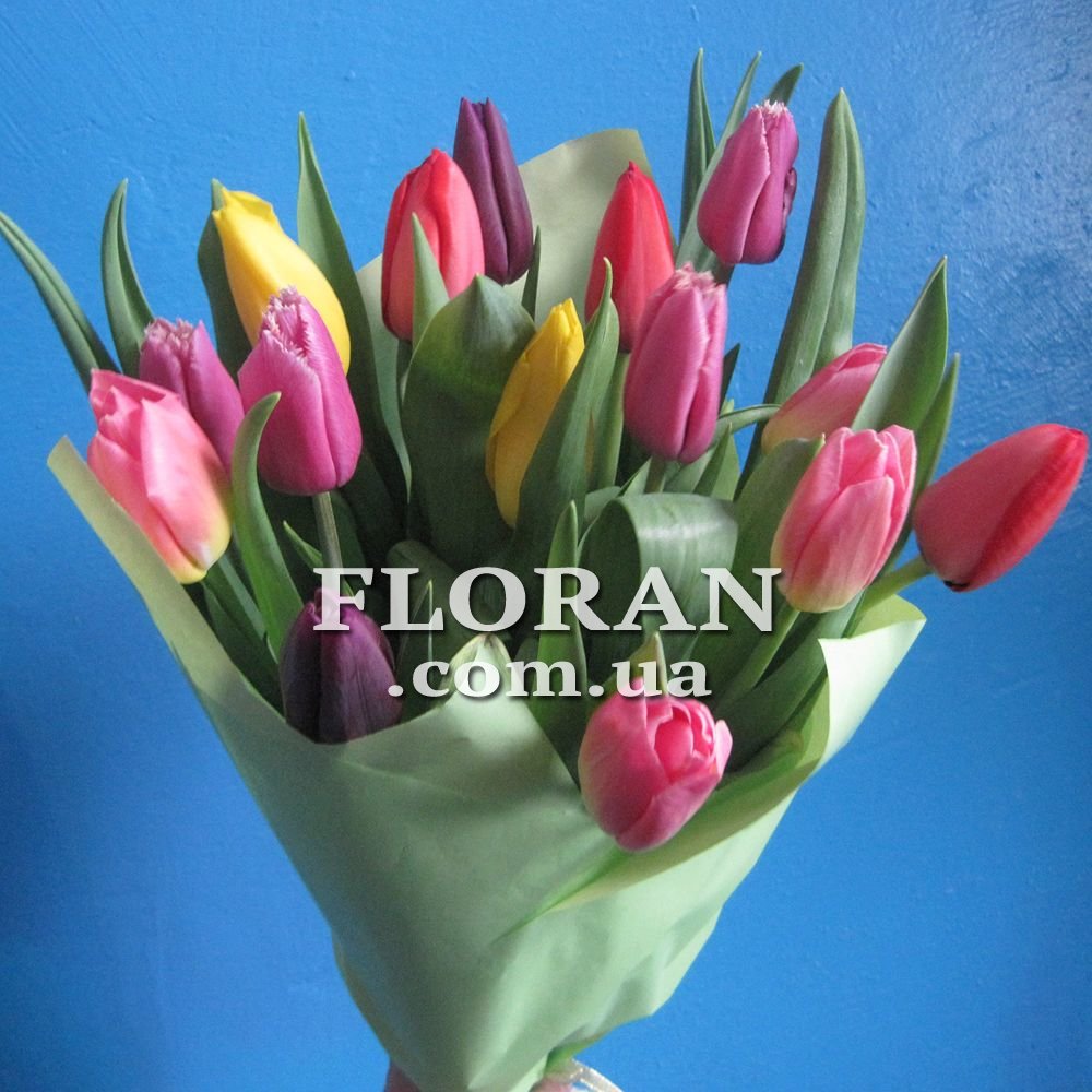 Букет цветов тюльпаны - код товара FL-387. 15 разноцветных тюльпанов в букете создают яркое и незабываемое впечатление. Тюльпаны - это символ весны и надежды, они прекрасно подходят для подарка близкому человеку или коллеге. Букет из 15 тюльпанов разного цвета - это отличный выбор для тех, кто хочет порадовать своих близких ярким и красочным подарком. Из тюльпанов можно составить букеты разной формы и размера, что делает их универсальными для любого случая. Тюльпаны - это цветы, которые всегда будут в моде и которые никогда не потеряют своей красоты и изящества. Если вы хотите порадовать своих близких ярким и красочным подарком, то букет цветов тюльпаны - это именно то, что вам нужно.