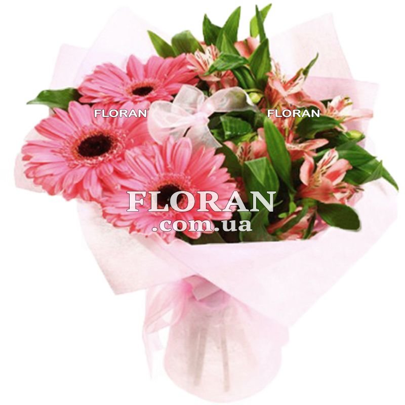 3 розовые герберы, 6 розовых альстромерий, упаковка