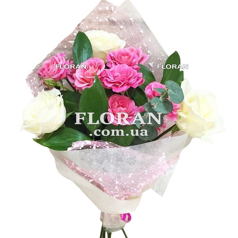 Букет для девочки - код товару FL-1196 - прекрасный способ порадовать маленькую принцессу. Вот простой и нежный букет, который она будет в восторге: 3 белые розы, 2 розовые кустовые розы, зелень и упаковка. Белые розы символизируют чистоту, нежность и невинность. Они идеально подходят для девочек, создавая атмосферу чарующей красоты. Белый цвет также ассоциируется с радостью и чистотой души. Каждая белая роза будет передавать нежные чувства и благополучие. Розовые кустовые розы добавят нежности и игривости в букет. Розовый цвет символизирует нежность, дружбу и нежную любовь. Он отлично подходит для маленьких девочек, придавая букету воздушность и очарование. Зелень, добавленная в букет, придаст ему свежесть и естественность. Она будет создавать гармоничный фон для роз и подчеркивать их красоту. Упаковка букета придаст ему завершенный вид и добавит таинственности. Этот букет из белых и розовых роз, с добавлением зелени, будет прекрасным подарком для маленькой девочки. Пусть каждая роза напоминает ей о красоте, дружбе и нежности. Пусть этот букет принесет ей радость и счастье, наполнив ее сердце теплом и любовью.