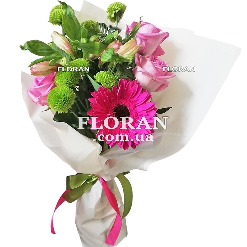 1 розовая гербера, 3 розовые розы, 2 зеленые хризантемы, 1 розовая альстромерия, упаковка